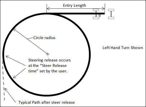 入口長さの直線道路セクションは、車両モデルが定常状態の直進運転になるように組み込まれています。車両は定常円旋回のコーナーに入り、ハンドルを解放する前に、コーナリングが定常状態に到達できるようになります。