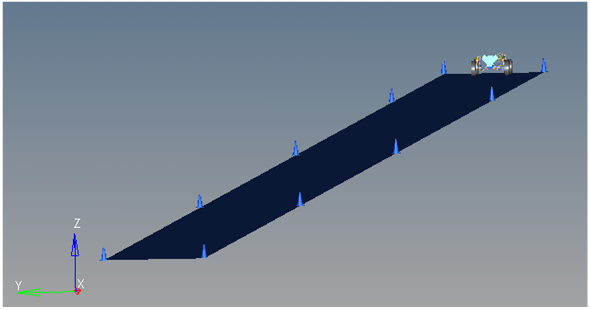 タイヤ力を計算するために使用される道路は、道路のグラフィックスと同じ高さで、タイヤシステム内の道路のファイル(rdf)によって定義されます。車両ライブラリ内のデフォルトの平坦な道路のファイルは、摩擦係数が1.0の無限の大きさの平坦な道路です。道路のファイルはASCIIファイルで、編集可能です。