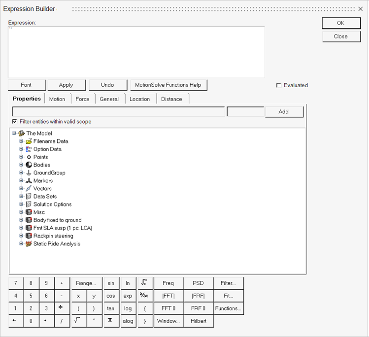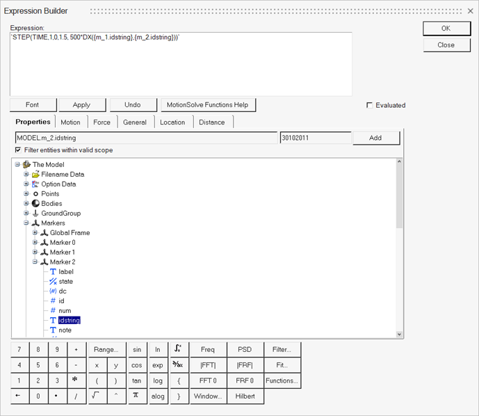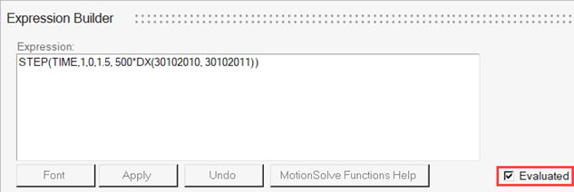 注: マーカーとその他のMotionSolveエンティティのIDは、モデルをソルバーにエクスポートするか、MotionViewの“Check Model”操作を実行するまで定義されません。したがって、パラメトリックな式をExpression Builderダイアログボックスで評価すると、Expression BuilderのマーカーIDが空白で表示される場合があります。Evaluatedチェックボックスをチェックした場合は、Templexパーサーがソルバー関数(中括弧で囲まれたパラメトリック値と式)にのみ適用されます。式にある他の情報の正しい形式はソルバーに依存することから、MotionViewではチェックされません。例えば、Step関数に“stp”と記述した場合、MotionViewでは、Evaluatedがアクティブになっていてもエラーメッセージが生成されません。一方、MotionSolveでは実行時にエラーが発生します。