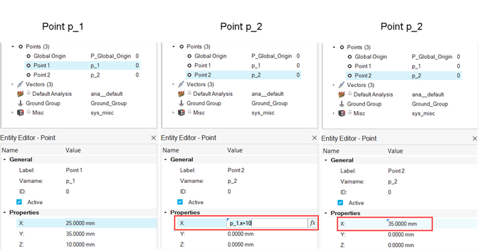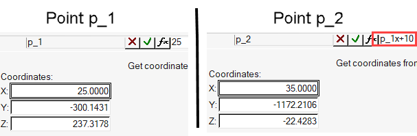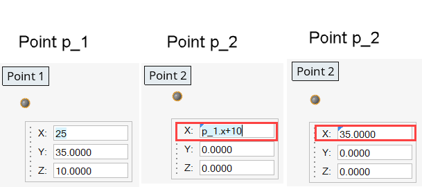 モデルの中で変数名として“p_1”と“p_2”を持つ2つのポイントについて考えます。“p_1”のX位置から+10単位離して“p_2”のX位置をパラメトリックに配置するには、Templexのパラメトリックな式を使用できます。“p_1”の“x”座標のパラメトリック値は、データメンバー“x”であり、式“p_1.x”で指定します。したがって、ポイント1のX位置から+10単位離してポイント“p_2”を配置するには、下の図に示すように、式“p_1.x + 10”を“p_2”のX座標欄に入力します。