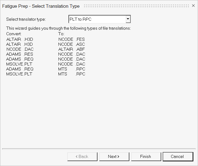 | MSOLVE PLT → nCODE DAC | MSOLVE PLTファイル内のデータのベクトルをnCODE DACフォーマットに変換します。各データのベクトルについて1つのDACファイルが作成されます。 |