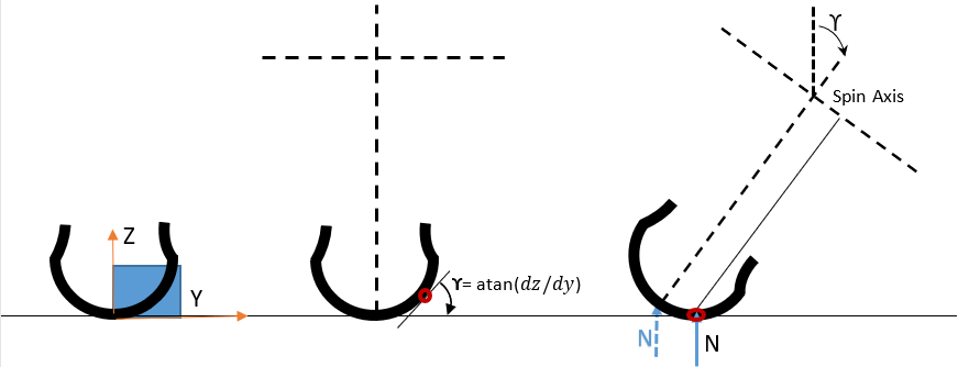 Fialaモデルで使用するデフォルトの接触法です。このモデルでは、タイヤとリムが“ディスク”形状であると見なし、ホイール平面とホイールに対する路面上の接線との交差位置となる接触点を計算します。オートバイのタイヤは、自動車のタイヤよりも大きな曲率を持っています。車体が傾斜した状態では、理論的な接触点が横方向に移動します。この挙動をモデル化するために、タイヤのカーカス形状を使用します。