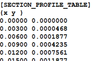 SECTION_PROFILE_TABLEは、タイヤのカーカスのデータを記述しています。この表は、下記のように2つの列で構成する必要があります。