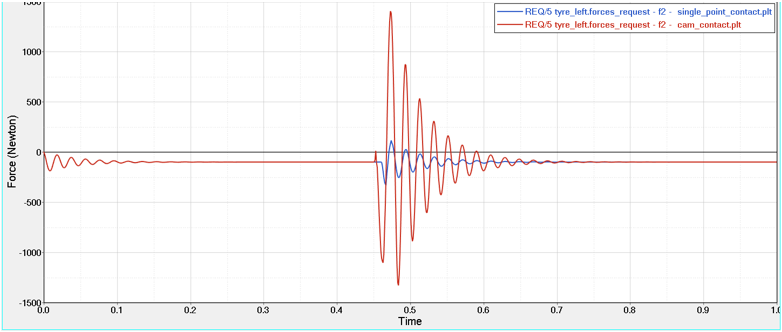 この結果は、単一点接触モデルの方が強い垂直力が発生することを予測していますが、これは障害物の形状をたどっているからです。タイヤが実際に受けるフォースは、カム接触法を使用して予測した値に近くなります。