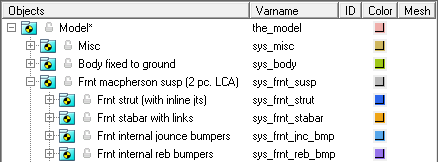 新しいサスペンションモデルを構築するときは、モデルに含まれるオプションのシステム(スタビライザーバーなど)をすべて使用してモデルを構築します。Projectブラウザを使用してオプションのシステムを直ちにオフにし、ベースサスペンションに対する解析を実行して適切な解が得られるようにします。オプションのシステムでデータを利用できるようになったら、これらオプションのシステムをアクティブにしてデータを読み込みます。
