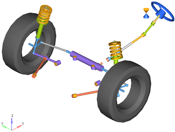 以下の図では、すべてのデータが読み込まれたフロントサスペンションモデルのシステムがProjectブラウザのビューに表示されています。フロントマクファーソンストラット式サスペンション(2 pc LCA)システムには、4つの“子”システムがあります。- Assembly Wizardを使用すると、サスペンションとサブシステムとの多彩な組み合わせを構築できます。グラフィカルユーザーインターフェースを使用して、システムを構築し、作成したモデルを理解することをお勧めします。