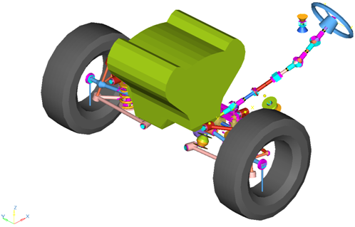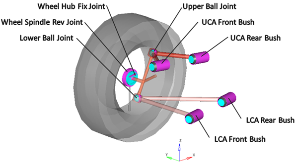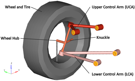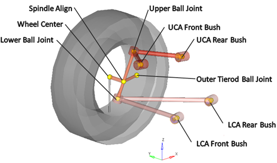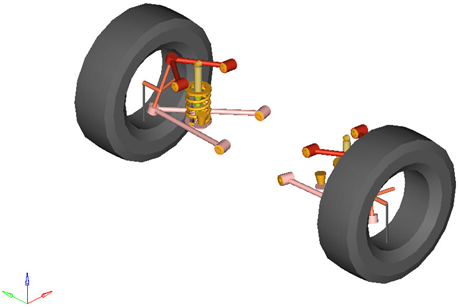 従来のデザインでは、コイルスプリング(または任意でトーションバー)、ショックアブソーバー、およびジャウンスバンパーは、ロアコントロールアームとシャシーの間で機能します。ロアコントロールアームは荷重の大部分を支持し、ナックルにおけるロアの球ジョイント位置の動きを定義します。アッパーコントロールアームは軽い荷重を支持し、ナックルにおけるアッパーの球ジョイント位置の動きを定義します。ナックルのステアリングモーションは、ステアリングシステムのタイロッドおよびモーションによって制御されます。車両ライブラリでは、ステアリングシステムにタイロッドが含まれています。