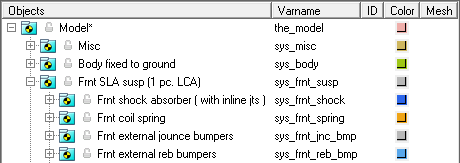以下の図では、すべてのデータが読み込まれたフロントサスペンションモデルのシステムがProjectブラウザのビューに表示されています。フロントダブルウィッシュボーン式サスペンション(1 pc LCA)システムには、4つの”子”システムがあります。