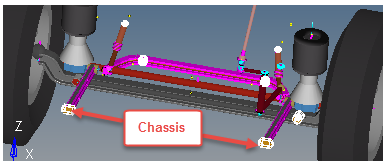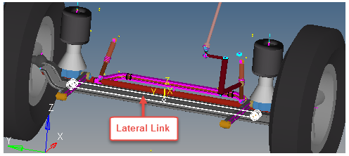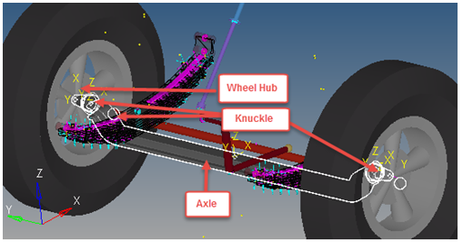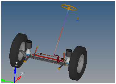 フロントソリッドアクスルサスペンションには、ソリッドフロントアクスルが取り付けられた車両フレームを支持するサスペンションシステムがあります。ソリッドフロントアクスルの両端には、ステア可能なフロントホイールが取り付けられています。フロントサスペンションは、ステアリングサブシステム、スプリング、ダンパ、スタビライザーバー、ナックル、タイロッド、ホイール、ホイールハブ、バンパーなどの部品で構成されています。Assembly Wizardで構築したフロントソリッドアクスルサスペンションがMotionViewのウィンドウに表示されます。図 1.