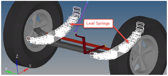 - リーフスプリングは、フロントソリッドアクスルサスペンションに使用し、2点でフレームに取り付けられています。リーフスプリングの両端は、ロッドの最上部またはソリッドアクスルの最上部に取り付けることができます。アクスルは、リーフスプリングによって垂直方向に支持されています(多くの場合、リーフスプリングは複数の方向で支持するために使用されてきました)。