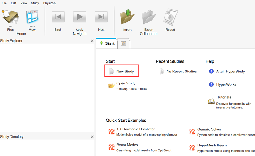 HyperStudy - Add Studyダイアログが閉じ、新しいスタディが作成されます。アプリケーションのビューには、作業エリアと共に、左側にExplorer/Directoryページが表示されています。