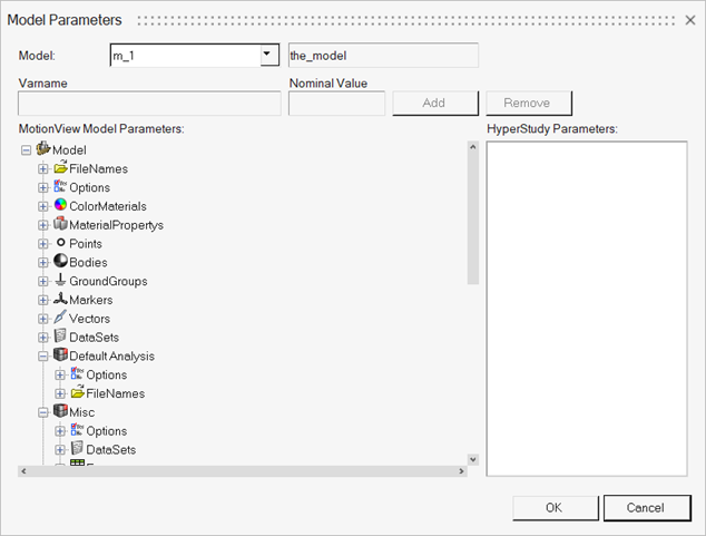 Model Parameter Treeダイアログが表示されます。注: このダイアログが非表示になっている場合があります。必要に応じてMotionViewアプリケーションをクリックし、このダイアログを表示します。図 1.