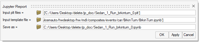 JupyterレポートをJupyter Notebookファイル(ipynb)としてユーザー間で送信できます。重要なのは、入力pltファイルをレポートファイルと同じディレクトリに格納すること、およびMotionView内からLaunch Jupyter Reportリボンサテライトを使用してJupyterレポートを起動することです。レポートをpltと共に交換しても、レポートの変更および拡張機能は削除されません。