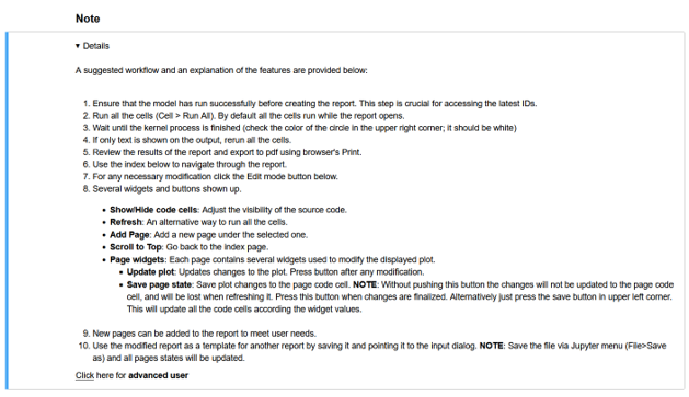 現在のNotebookセルが再実行された場合は、2つ目のボタン(Save page state)もクリックしないと、これらの変更は削除されます。Save page stateをクリックすると、すべての新しい変更をレポートに保存できます。また、Jupyterリボンからドキュメントを保存すると(File > SaveおよびCheckpoint)、すべてのページでインターフェースウィジェットの新しい状態が自動的に保存されることにも注意してください。予期せぬオーバーライドを回避するため、自動保存は無効化されています。