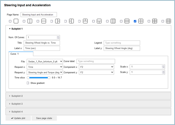これらすべてのウィジェットを使用して、ページのすべてのカーブとすべてのサブプロットのプロットパラメータを変更できます。これには、レイアウト、名前のラベルとタイトル、入力ファイル、要求とコンポーネントの信号、スケーリングと時間スライスが含まれます。下部には、2つの重要なボタンが配置されています。1つ目のボタンUpdate plotは、入力プロット値に加えられた更新を適用するのに使用します。