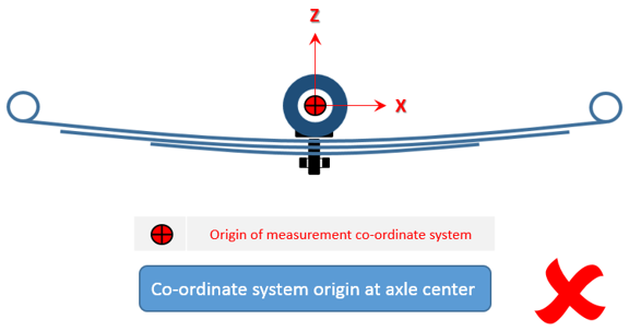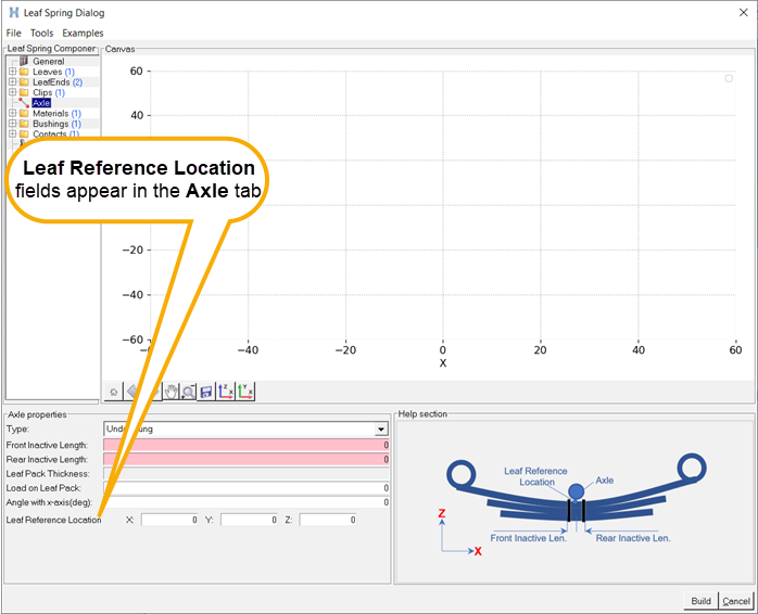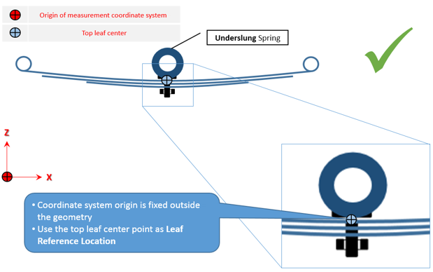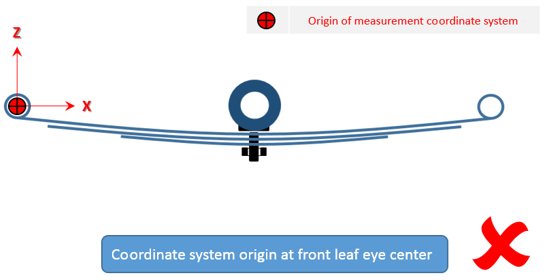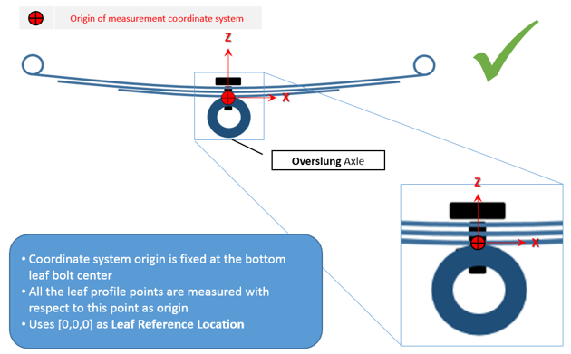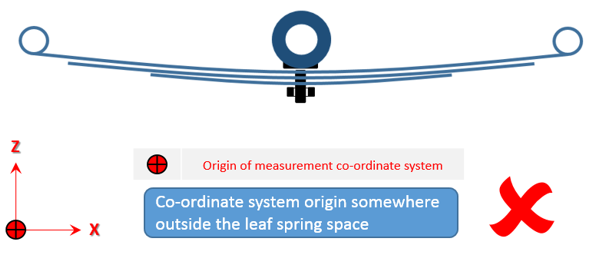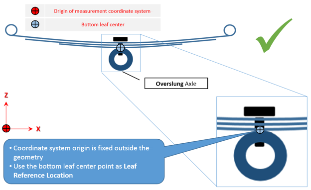 - フリー形状では、リーフがパックに組み立て済みになっていますが、車両には取り付けられていません。すべてのリーフがまとまって単一のユニットを形成します。この状態では、一貫した座標系でのみ測定を行う必要があります。また、Axleタブで正しいリーフ参照位置を入力する必要があります。この位置にリーフ参照マーカーが作成されます。