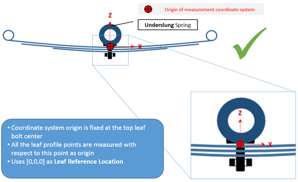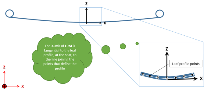 Leaf Spring Builderが作成するのは、ソフトウェアで入力されたリーフ形状入力と同程度のMotionView MDLリーフスプリングモデルのみです。そのため、必要な座標系におけるリーフ形状の正確な測定が重要になります。座標系、その原点、および向きは、Leaf Spring Builderからリーフスプリングを作成するときに役立つ特定のルールに従う必要があります。以降のセクションでは、フリー形状状態と組み立て前の形状状態用の座標系と測定方法について説明します。