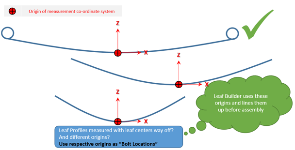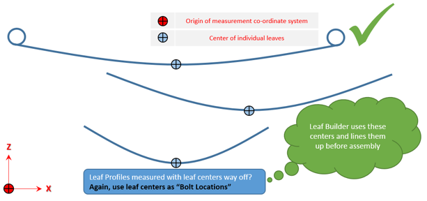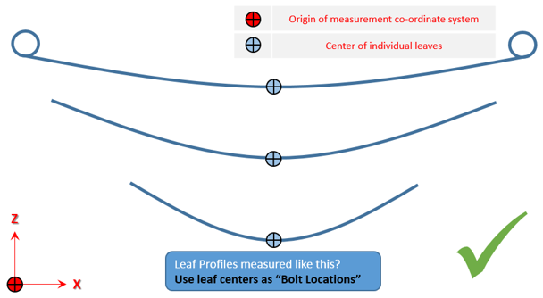 - Pre-Assembly:Pre-Assemblyには、各リーフごとに個別のリーフプロファイルがあります。これらの個別のリーフプロファイルは、組み立て荷重を伴って、ボルトで一緒に固定できます。下の図は、リーフのデータがどのように収集されるかを示しています。各リーフのフリー形状データが使用可能な場合は、このオプションを使用してリーフパックを作成することをお勧めします。