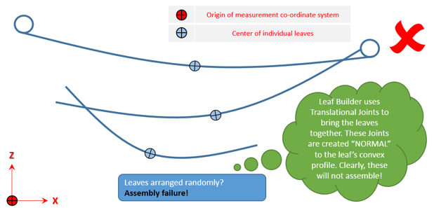 - 各リーフのボルト穴の軸が、他のすべてのリーフおよびZ軸平行になる必要があります。各リーフの垂直位置は、リーフどうしが接触しないように、組み立て中にMotionSolveによってオフセットされます。