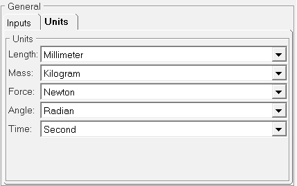 単位は、すべてのタイプのデータファイルをビルダーで読み取るために必要です。ファイルで使用する長さ、質量、フォース、角度、および時間の単位を、この属性で指定します。現時点では、デフォルトの単位を使用する必要があり、単位を制御することはできません。図 21. General - Unitsタブ