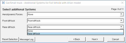 LSDは、Assembly Wizardを使用して車両モデルを構築するときに含めることができます。“Additional Systems for Full Vehicle with driver model”ページで、Front diff lockまたはRear diff lock(あるいは両方)を選択します。図 1. 4WDコンフィギュレーションのデフロックの選択