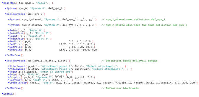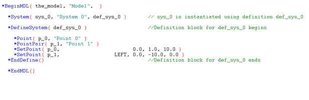 システム、アセンブリ、解析などのコンテナエンティティは、データセットやテンプレートなどの他のエンティティとともに、定義ベースのエンティティと呼ばれます。これらのエンティティは、定義ブロックを参照するMDLのインスタンス化ステートメントによって作成されます(インスタンスによってコールされます)。次の例を参照してください: