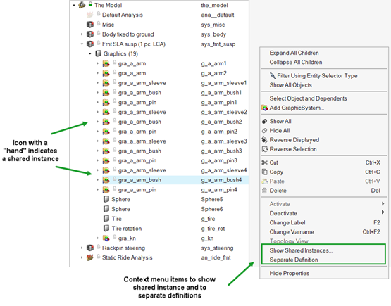 - モデルブラウザでは、エンティティの標準アイコンに別個の手のアイコンを付加することで、インスタンス間の共有が示されます。この変更が適用されるエンティティは、システム、解析(インライン)、グラフィックシステム、データセット、テンプレート、コマンドセット、フォームです。