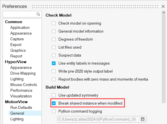 - Break shared instance when modifiedオプションは、Preferences ダイアログ(File > Preferences)のMotionView > Build Modelセクションにあります。これは、共有インスタンスの変更時にそれらのインスタンスを処理する方法を制御します。