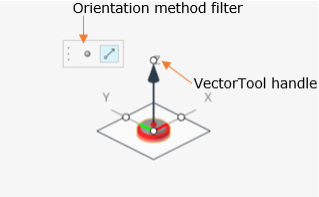 このツールは、方向を示すベクトル矢印と、ベクトル方向に対して垂直な平面で構成されています。矢印の先端には円形のハンドルがあります。このツールには、向き設定方法のフィルターとして使用するPointアイコンとVectorアイコンを含むマイクロダイアログも付随しています。