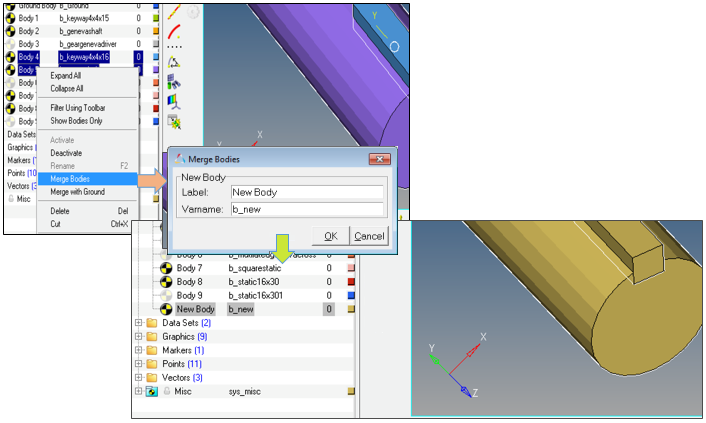 Merge Bodiesが選択されると、Merge Bodiesダイアログが表示されます。このダイアログでは、マージされたボディの新しいLabelとVarnameを入力できます。OKをクリックしてダイアログを閉じると、以下の処理が行われます: