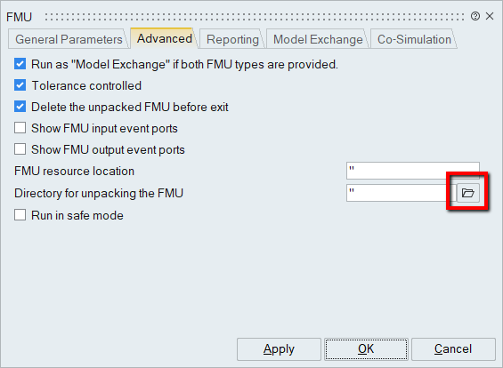 このほか、Advancedタブで、FMUの展開先とするディレクトリを指定できます。このディレクトリを指定しない場合、Twin Activateではデフォルトでtempディレクトリが使用されます。MotionSolveの出力ファイルの場所を相対パスで指定した場合、展開先ディレクトリが基準ディレクトリになります。