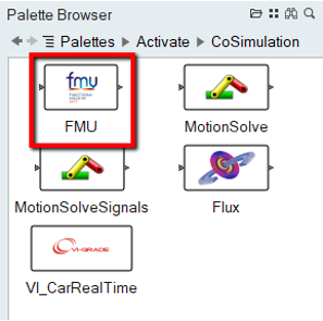 Twin Activateでは、PaletteブラウザのCoSimulationパレットに用意されているFMU Importブロックを使用して、MotionSolve FMUを読み込むことができます。