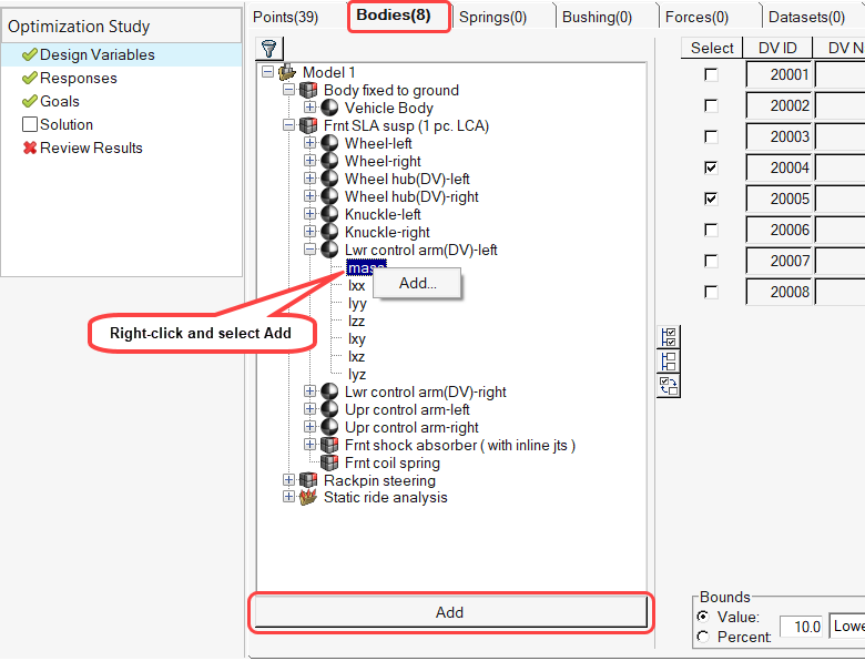 Optimization Wizardダイアログで、設計可能エンティティのタブ(Points、Bodiesなど)のいずれかをクリックします。