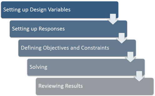 システムの最適化を実行するには、まず既知の初期設定による名目上の作業モデルを作成し、次の5つの手順で構成する最適化スタディの実行に移ります。図 1.