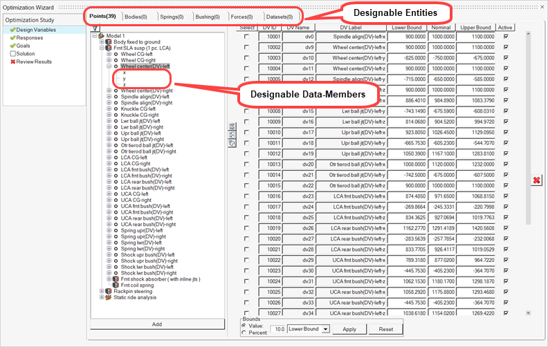 このウィザードの‘Design Variables’の手順で、最適化スタディにDVを追加できます。さまざまなエンティティのタブで選択操作を実行することにより、モデルのエンティティのデータメンバーをDVとして選択できます。各タブには、現在のモデルに存在する特定のタイプのエンティティが一覧表示されています。図 2.