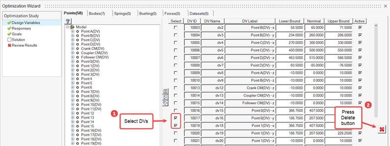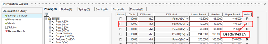 1. 設計変数を非アクティブにするには、Active列で目的のDVのチェックボックスを選択解除します。