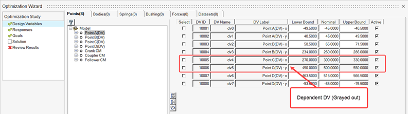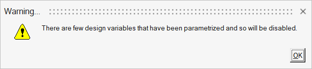 • 既存のDVに相当するデータメンバーを、最適化ウィザードの外部でパラメトリック(従属数量)にすると、そのDVは無効になり(以下の図のようにグレイアウトされます)、最適化スタディで考慮されなくなります。この場合は、ウィザードを開始すると警告も表示されます。