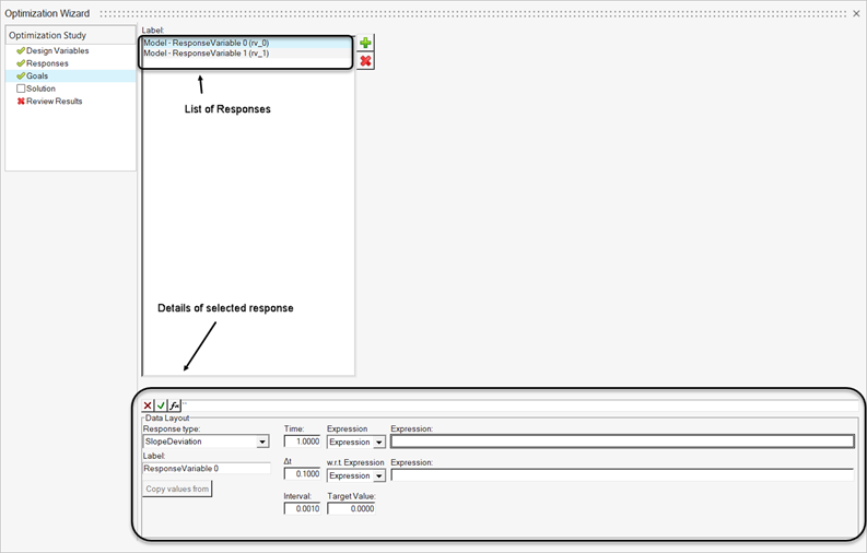 最適化ウィザードのResponsesの手順で、最適化スタディに応答変数(RV)を追加できます。