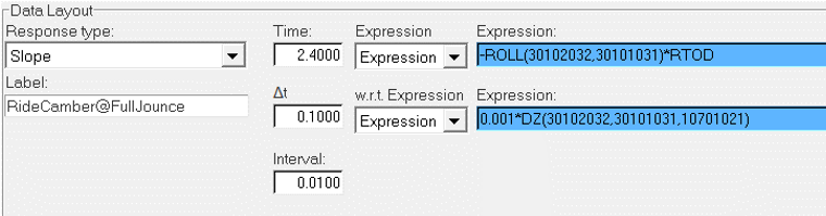 上記の例では、ロール位置(Ride Camber)を縦軸、マーカーの相対的なZ方向変位(Full Jounce)を横軸にとった曲線の時間値2.4における傾斜を取得しています。