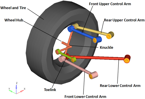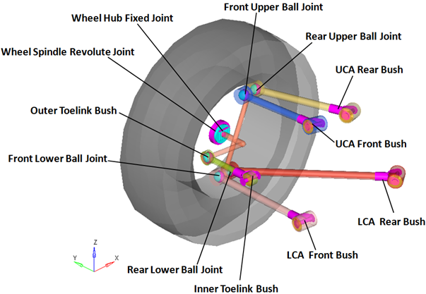 | Inner Toe Link Bush | 球 | トーリンク | サブフレーム、車体、または地面 | インナートーリンクブッシュ | CompliantオプションがNoに設定されると、このジョイントのコンプライアンスは“オフ”に設定され、純粋なユニバーサルジョイントとして動作します。 |