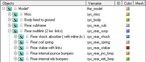- オプションのサブシステムにより、ボディがサスペンションに追加されることがあります。例えば、ショックアブソーバーにより、2つのボディ(ショックロッドとショックチューブ)が追加されます。オプションのサブシステムで追加されたボディは、わかりやすいように、上の図からは省略されています。