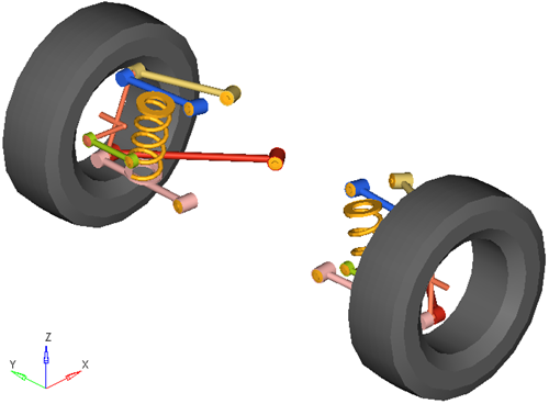 rear multi-linkサスペンションシステムは、車両半分の解析またはフルビークルの解析のどちらでも使用できます。デフォルトの形状および質量は乗用車または小型トラックと同じですが、モデルおよびデータは、大型トラックから縮尺モデルの車まで、任意のサイズの車両を反映するように修正できます。