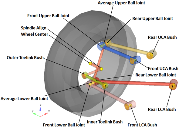 | Rear Upper Ball Joint | 球 | ナックル | リアアッパーコントロールアーム | リアのアッパー球ジョイント | CompliantオプションがNoに設定されると、このジョイントのコンプライアンスは“オフ”に設定され、純粋な球ジョイントとして動作します。 |
