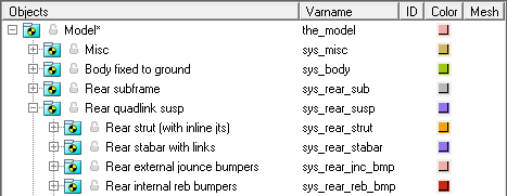 以下の図では、すべての構成要素を取り入れたリアサスペンションモデルのシステムをモデルブラウザビューで表示しています。リアクアッドリンク式サスペンションシステムには、5つの“子”システムがあります。