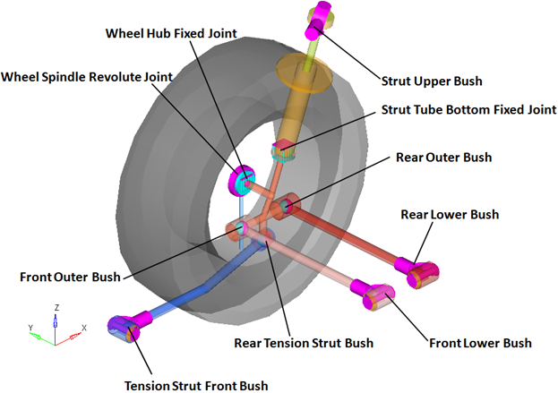 以下の図に、サスペンションでのジョイントとブッシュの位置を示します。