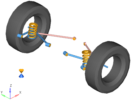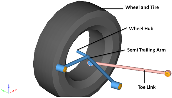 rear semi-trailing armサスペンションシステムは、車両半分の解析またはフルビークルの解析のどちらでも使用できます。デフォルトの形状および質量は乗用車または小型トラックと同じですが、モデルおよびデータは、大型トラックから縮尺モデルの車まで、任意のサイズの車両を反映するように修正できます。