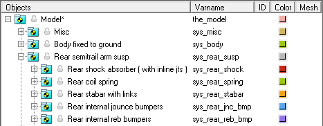 - オプションのサブシステムにより、ボディがサスペンションに追加されることがあります。例えば、ショックアブソーバーにより、2つのボディ(ショックロッドとショックチューブ)が追加されます。オプションのサブシステムで追加されたボディは、わかりやすいように、上の図からは省略されています。