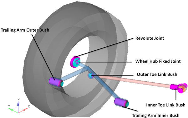以下の図に、サスペンションでジョイントとブッシュが占める位置を示します。図 6. 右側のジョイントとブッシュ:リアセミトレーリングアーム式サスペンション