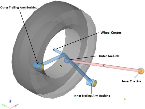 ポイントによって、サスペンションのボディを互いに結合するジョイントとブッシュの位置を定めます。以下の図に、rear semi-trailing armサスペンションの主要ポイントを示します。 図 4. 右側の主要ポイント – リアセミトレーリングアーム式サスペンション