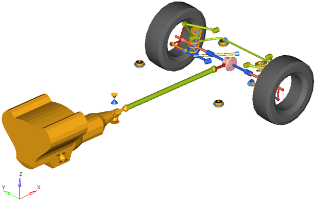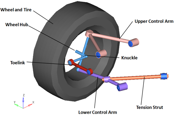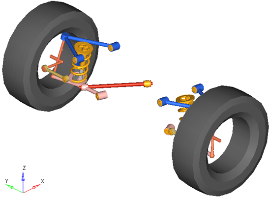 rear SLA (2pc LCA)サスペンションシステムは、車両半分の解析またはフルビークルの解析のどちらでも使用できます。デフォルトの形状および質量は乗用車または小型トラックと同じですが、モデルおよびデータは、大型トラックから縮尺モデルの車まで、任意のサイズの車両を反映するように修正できます。